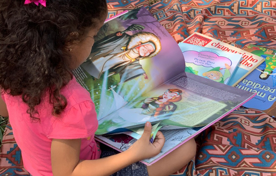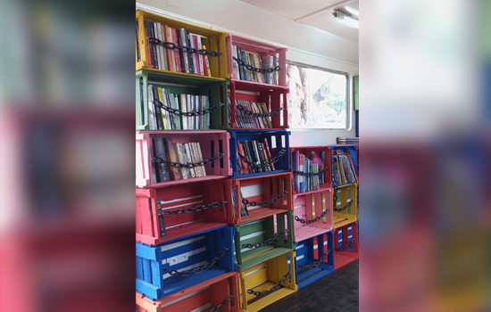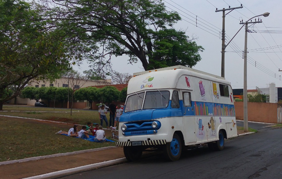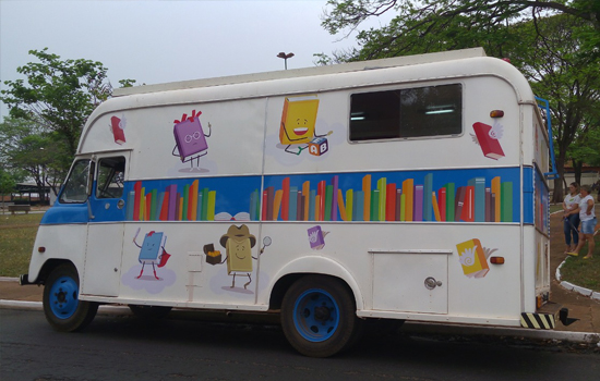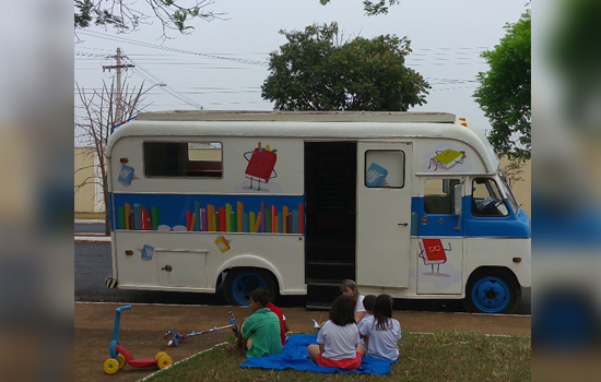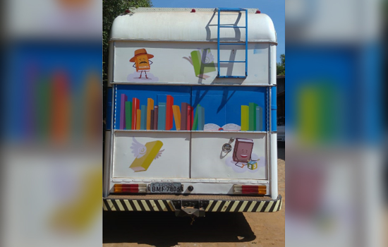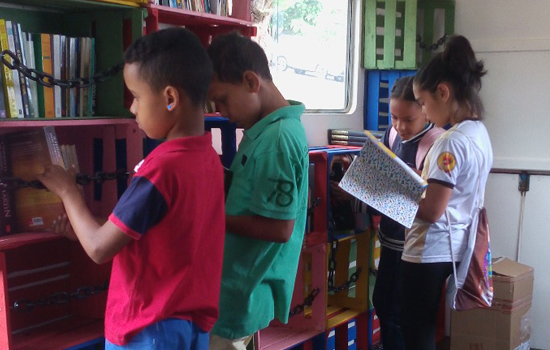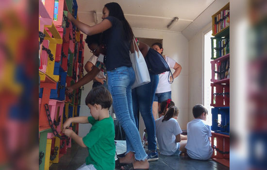 Chegando ao local, fazemos leituras com as crianças, elas podem ver os livros e adultos e adolescentes podem pegar emprestado e devolver na próxima visita.